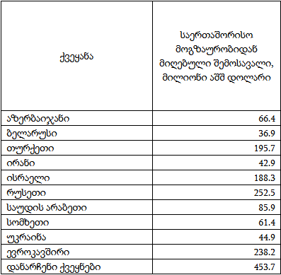 მათივე ცნობით, საერთაშორისო მოგზაურობიდან მიღებულ შემოსავალში 2025 წლის III კვარტალში ევროკავშირის ქვეყნების წილი 14.3%-ით განისაზღვრა და 238.2 მილიონ აშშ დოლარს გაუტოლდა - ზრდა წინა წლის ანალოგიურ მაჩვენებელთან შედარებით 13.3%-ია. სტატისტიკის მიხედვით, მაღალი ზრდის ტემპით გამოირჩევა აზერბაიჯანიდან და ისრაელიდან მიღებული შემოსავლები, შესაბამისი 36.3% და 28%-იანი წლიური ზრდის ტემპებით.