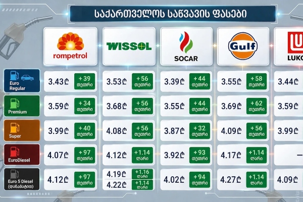 ირანში ომის დაწყების შემდეგ საქართველოში საწვავის ფასები და მათი ზრდის მაჩვენებლები ასე ნაწილდება: