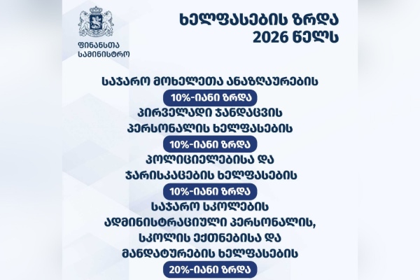 2026 წელს გათვალისწინებულია საჯარო მოხელეთა ანაზღაურების 10%-იანი ზრდა. ასევე განხორციელდება პოლიციელებისა და ჯარისკაცების ხელფასების 10%-იანი ზრდა. ფინანსთა სამინისტროს ცნობით, საჯარო სკოლების ადმინი...